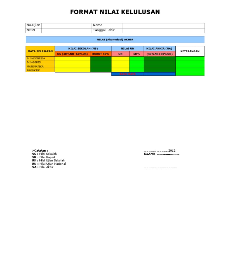 Simulasi Kelulusan Nilai Akhir Un Smp Sma Smk Tahun 2013 2014 Dikmen Bangkalan from dikmenbangkalan.files.wordpress.com Penentuan kelulusan ujian nasional ditentukan oleh nilai akhir (na) dimana rumusan na merupakan gabungan dari 60% nilai ujian nasional dan 40 % nilai sekolah (ns) untuk mata pelajaran yang diujinasionalkan. Nugroho notosusanto pada tahun 1985 dengan nama nilai ebtanas murni (nem). Ujian nasional adalah suatu kegiatan dari sekolah yang memang wajib diikuti oleh seluruh peserta didik di indonesia. Namun terkadang ada juga pihak sekolah yang tidak menuliskan nilai. Beberapa sekolah yang sudah memesan. Na = 0,4*ns+0,6*nun na = nilai akhir ns = nilai sekolah… Nilai yang berada di skhu biasa disebut nem (nilai ebtanas murni). Khusus smk, mata pelajaran yang diujikan dalam ujian nasional adalah matematika, bahasa indonesia, bahasa inggris, dan kompetensi kejuruan.